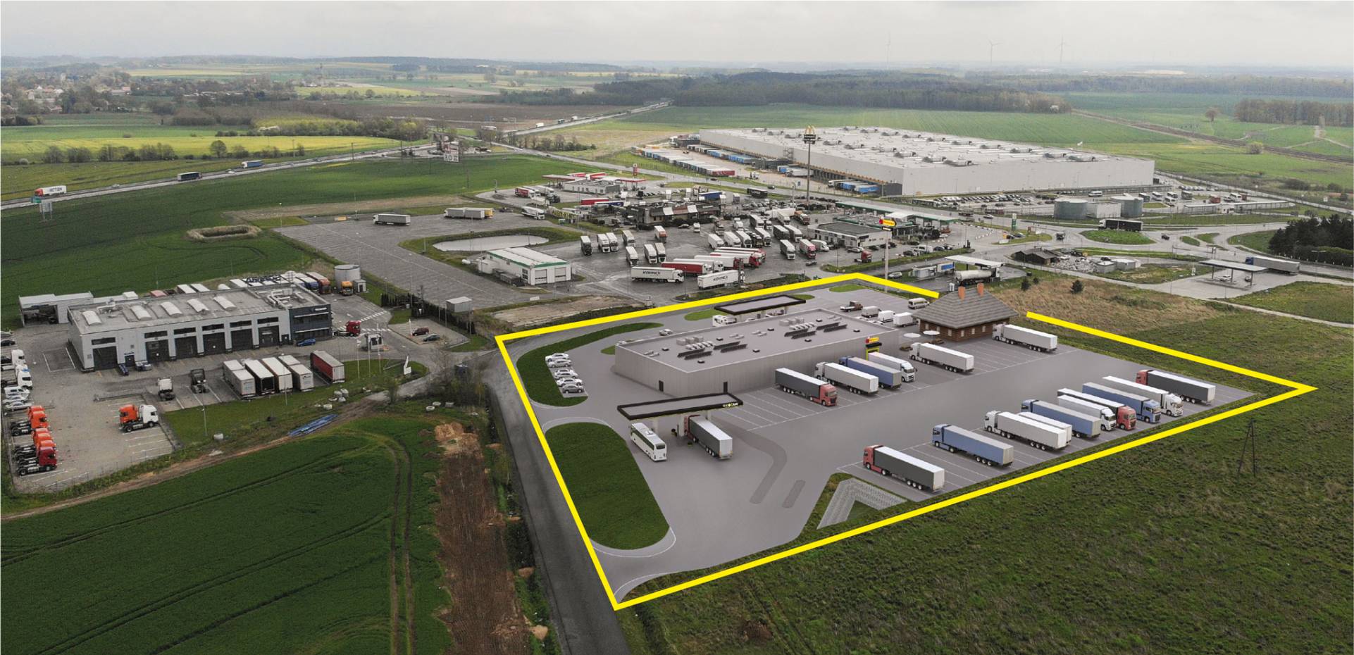 Stacja Paliw, Monitorowany Parking TIR na 100 miejsc, Market Biedronka, Pepco, Traker, Prysznice, Pralnia.